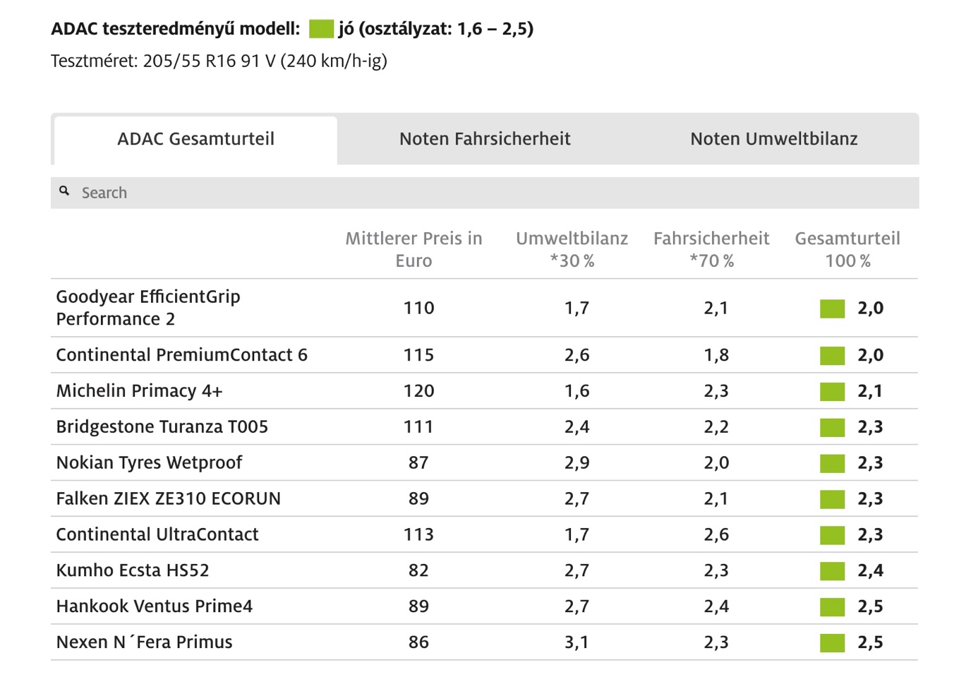 A lista végére hagytuk azt a 10 abroncsot, amelyekkel nem tudsz mellé nyúlni. A Goodyear Efficient Grip Performance 2 került ki tesztgyőztesként. Második helyezett a Continental PremiumContact 6, a harmadik helyezést pedig a Michelin Primacy 4+ érte el. A sorban következő a Bridgestone Turanza T005, a Nokyan Tyres Wetproof, a Falken ZIEX ZE310 ECORUN, a Continental UltraContact, a Kumho Ecsta HS52, a Hankook Ventus Prime 4 és végezetül, 10. helyen a Nexen N’Fera Primus áll.